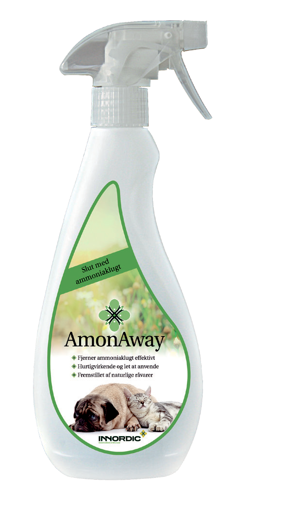 AmonAway er en helt ny, naturlig luftrenser, der neutraliserer ammoniaklugt fra urin m.m. Ammoniak-dampene omdannes til lugtfrit ammoniumsalt, som nedfældes i strøelse/kattegrus. Omkostningerne til strøelse reduceres, og arbejdet lettes, fordi langt mere kan genbruges. Særdeles velegnet til kattebakker og kanin-/gnaverbure samt urinuheld på gulvtæpper, møbler m.m. Let at håndtere og ufarligt for både mennesker og dyr jf. EU-direktiv 67/548 EEC, 1999/45 EC og 2001/58 EC.
