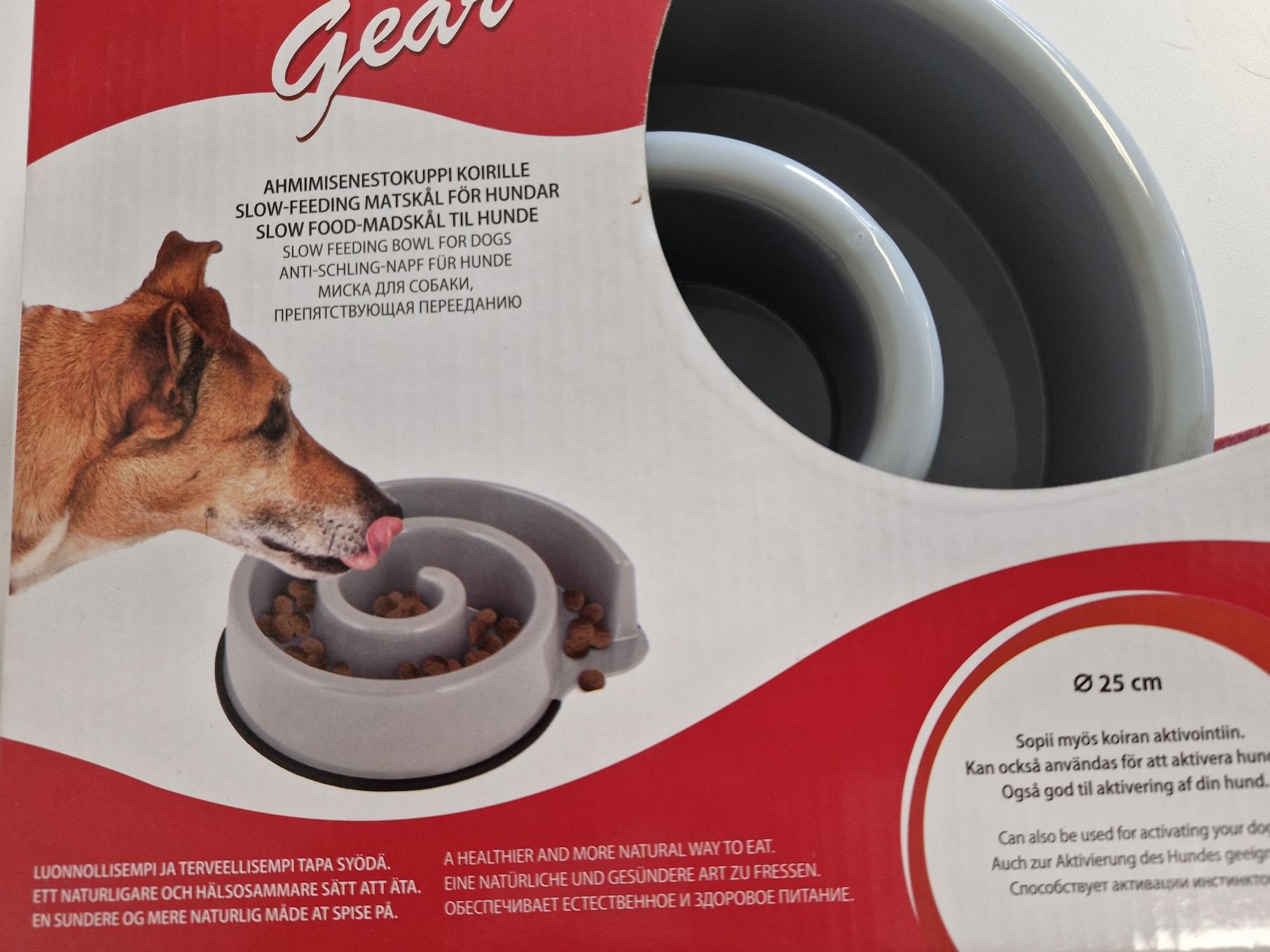 En Slow feed madskål gør der svært for hunden at få maden op af madskålen. Der gør at hunden ikke bare lige kan "køre rundt" i madskålen, og så er maden spist.