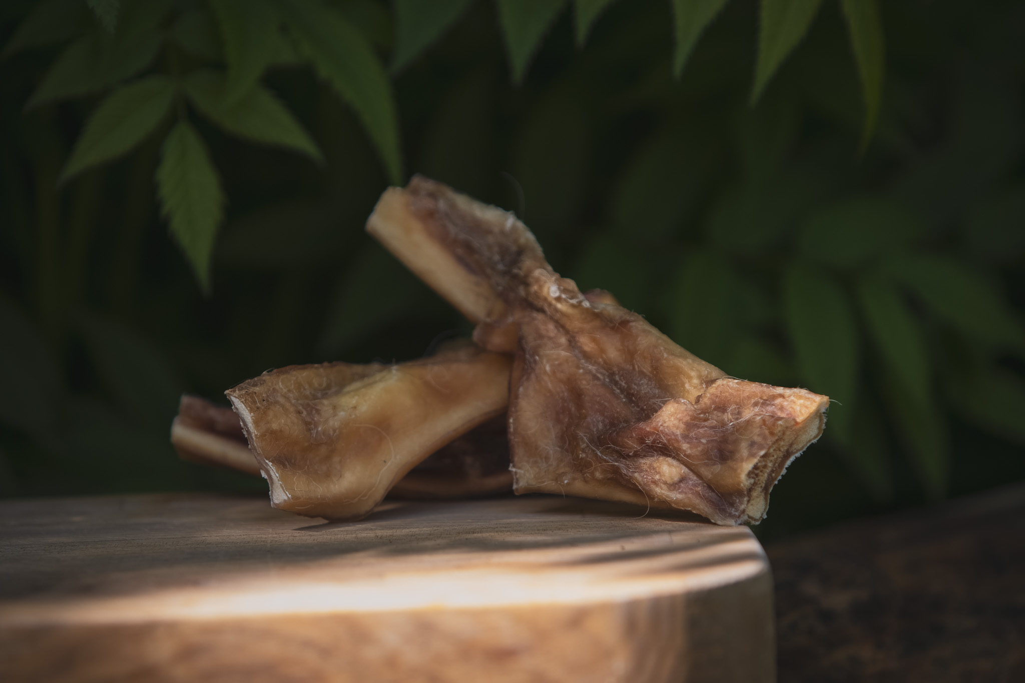 Oksehovedhud er en af de tørrede snacks, der giver længst tyggetid - også for de helt store hunde.