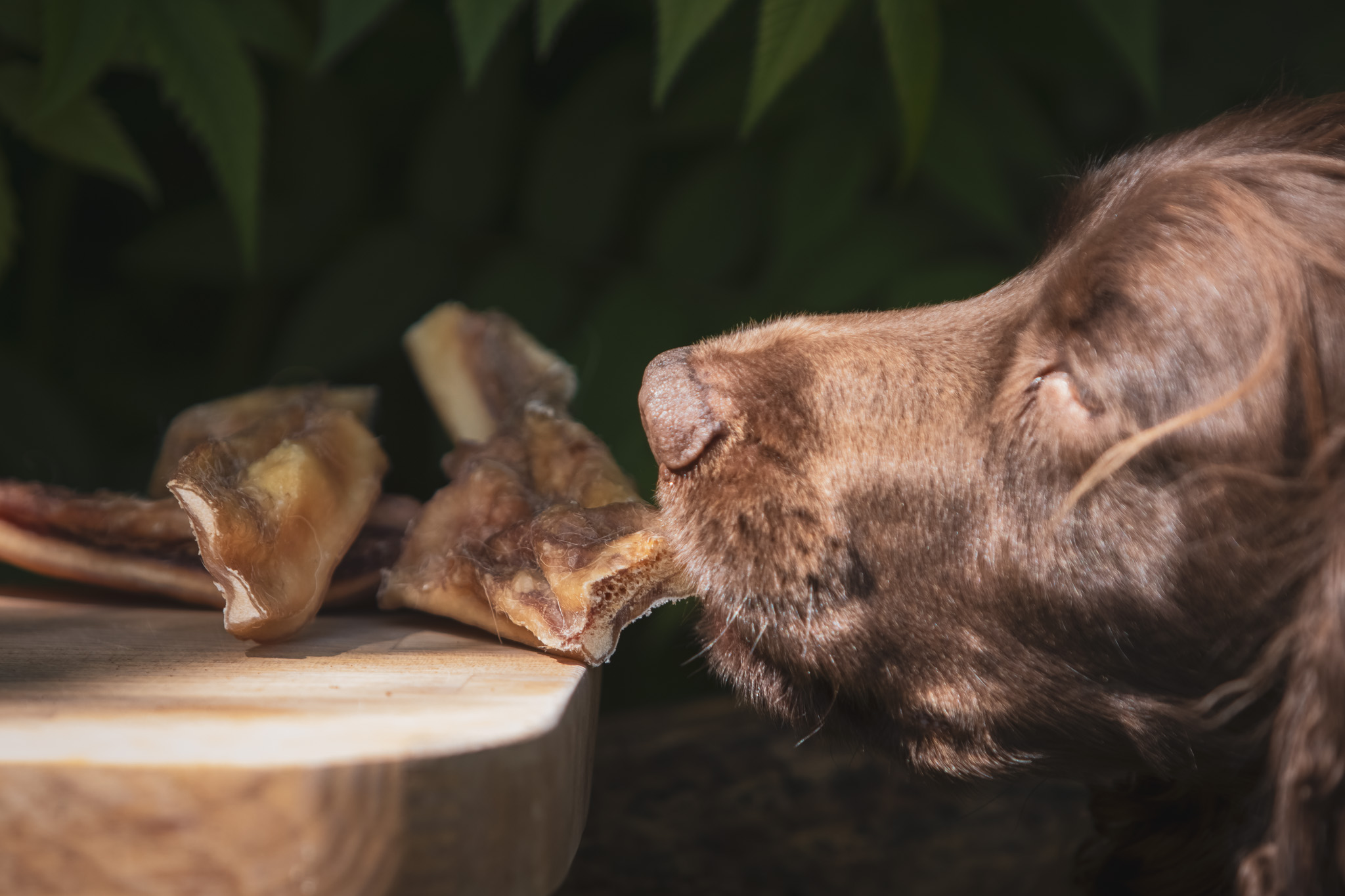 Oksehovedhud er en af de tørrede snacks, der giver længst tyggetid - også for de helt store hunde.